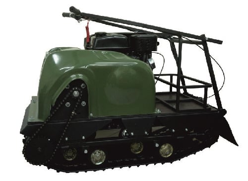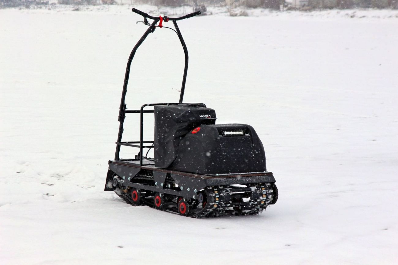 15 л.с. До 35 км/ч Двигатель 420 см³ Бак 5.5 л Гусеница 500 мм Масса 110 кг Габариты 180×59×84 см Нагрузка 40 кг + 150 кг в санях