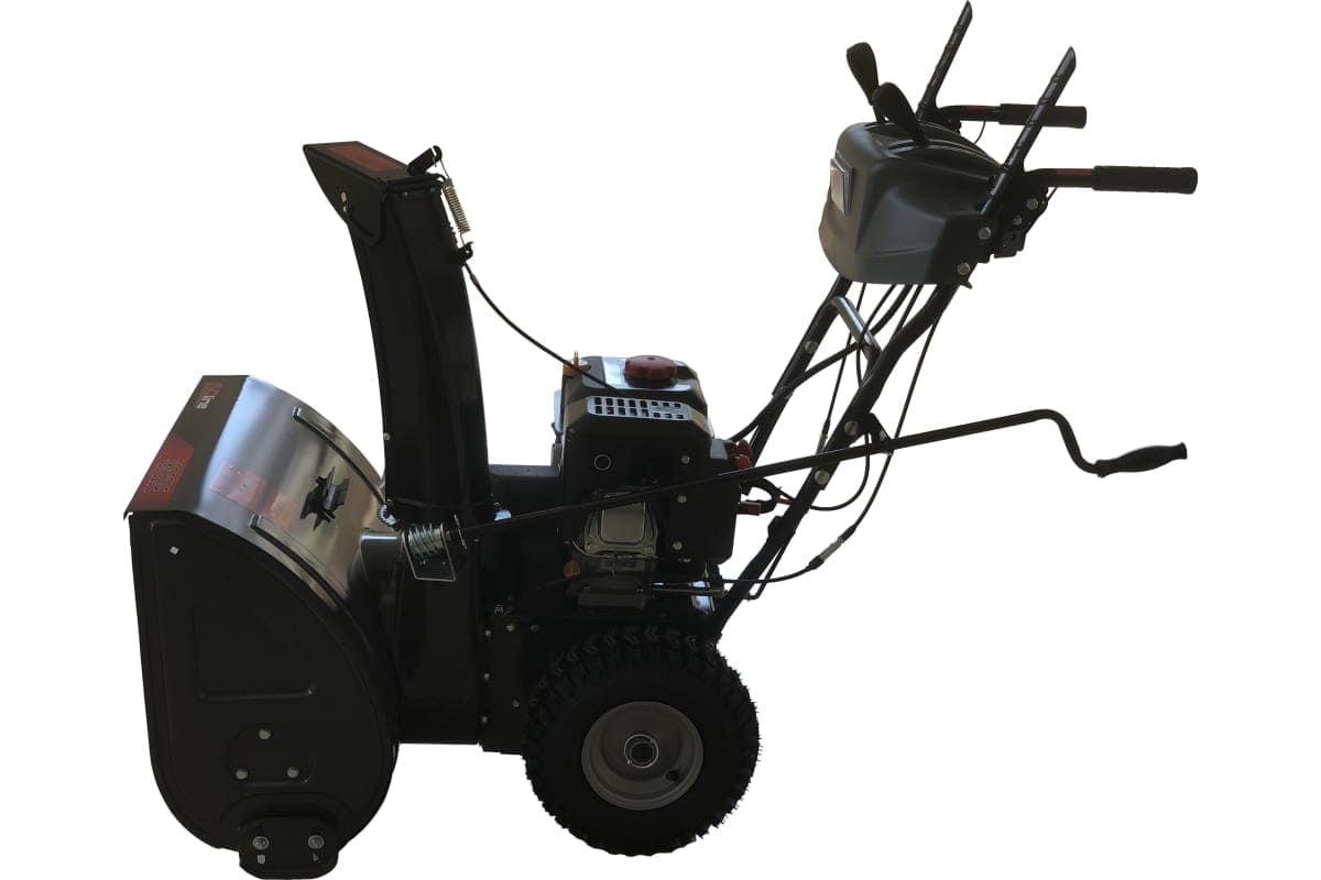 Двухступенчатая система со стальным шнеком эффективно измельчает наст и плотный снег, а крыльчатка выбрасывает массу через поворотный желоб.