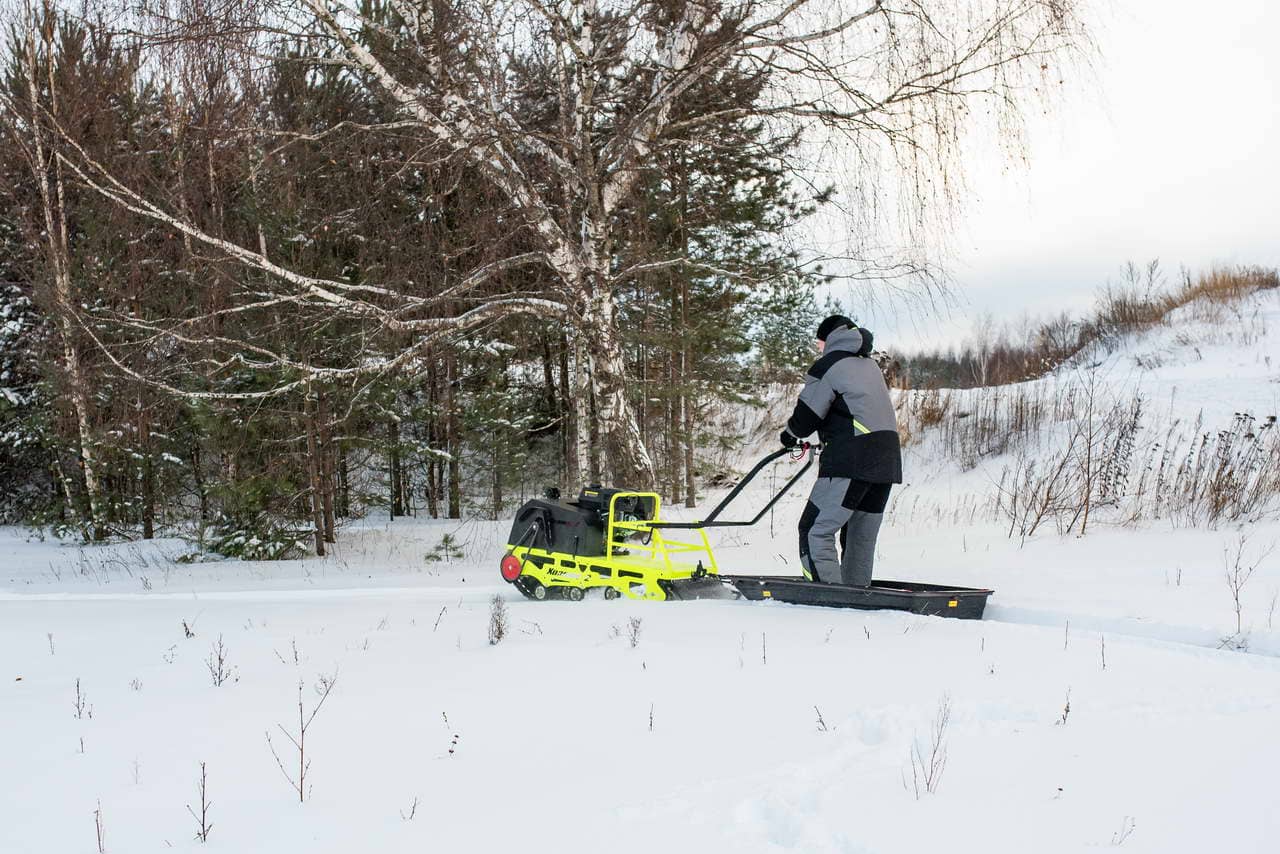 Мотобуксировщик выполнен с учётом потребностей охотников, рыболовов и фермеров. Он оснащён вместительным багажником для инструментов и других нужных вещей.