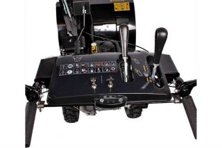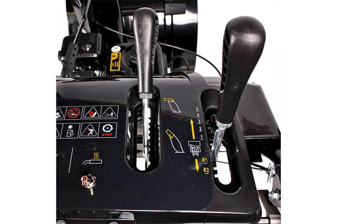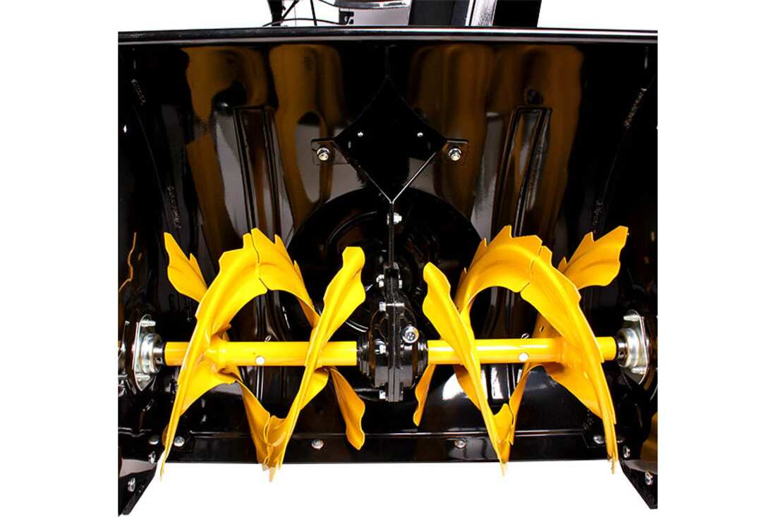 Машина оснащена стальным шнеком повышенной жёсткости, способным работать со слежавшимся настом. Металлический дефлектор позволяет перенаправлять струю выброса на угол до ~190°, что удобно при очистке вдоль зданий и парковочных мест. Колёса с выраженным протектором уверенно держат траекторию на скользкой поверхности, а разблокировка колёс облегчает развороты на ограниченном пространстве.