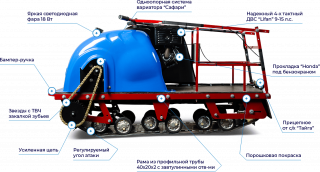 Конструкция ориентирована на надёжность и удобство: прочная рама, катковая подвеска и широкая гусеница