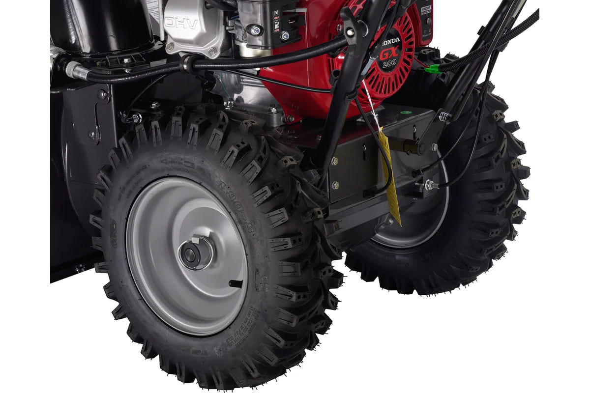 Самоходная двухступенчатая машина с надёжным двигателем Honda GX200 для очистки дорожек, площадок и парковочных мест. 4-тактный бензиновый мотор (196 см³) обеспечивает стабильную тягу и ресурс при работе в мороз. Стальной шнек захватывает талый и залежалый снег, измельчает наст; крыльчатка мощно отбрасывает массу. Dual-Trigger Steering: курки разблокируют дифференциал для лёгких разворотов на месте и точного ведения. Регулировка по высоте помогает не задевать неровности и бережёт покрытие на дорожках и площадках. Шесть передач вперёд и две назад позволяют подобрать темп под разные типы снега и рельефа. Подогрев рукояток и фара с широким рассеивателем поддерживают видимость и удобство в мороз и сумерки. Электростартер ускоряет пуск холодного двигателя; доступен и ручной запуск для универсальности. Все органы управления вынесены на панель напротив оператора — интуитивно и доступно в перчатках.