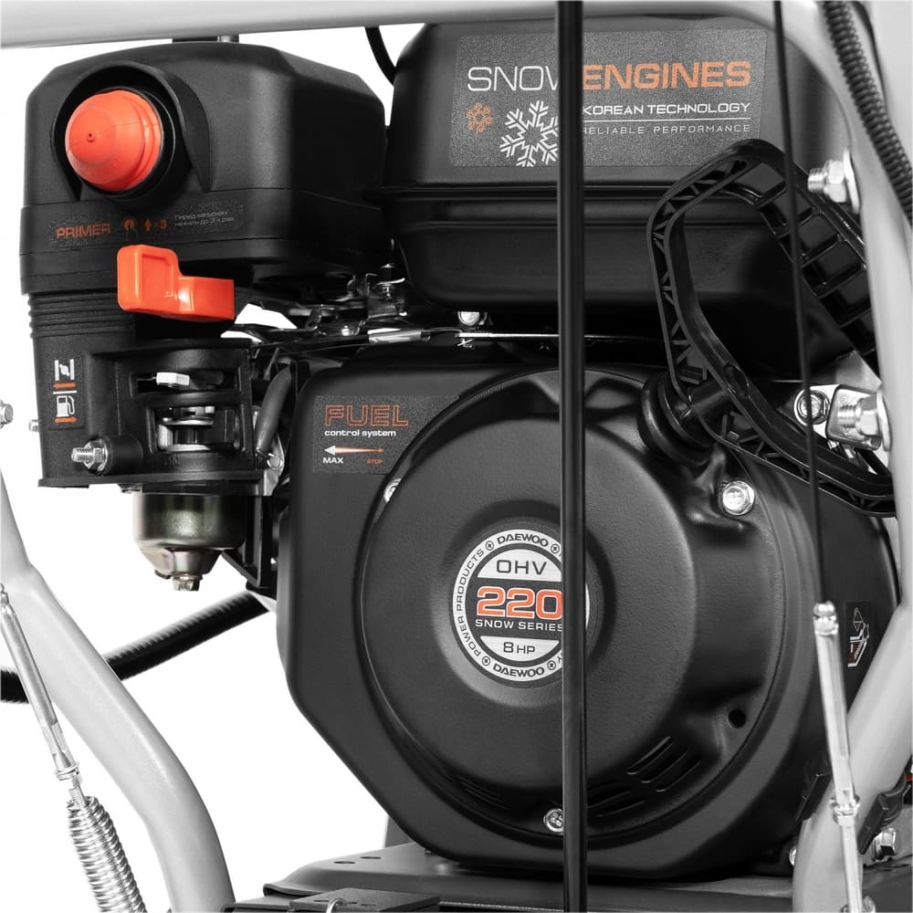 Бензиновый мотор 220 см³ с воздушным охлаждением и ручным стартером уверенно справляется со слежавшимся снегом.