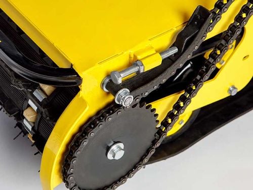 Ходовая часть упрощена для обслуживания: обрезиненные катки с сальниками работают чисто, а ведомая звезда самоочищается от наледи и снега.