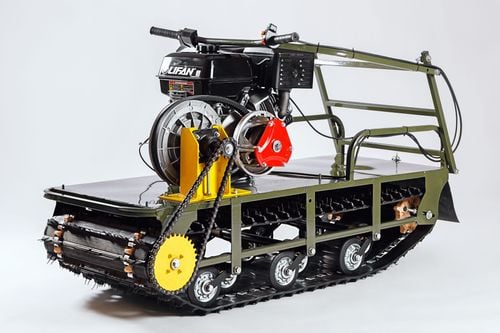 Гусеница шириной 500 мм в сочетании с катковой подвеской и подпружиненными тележками обеспечивает надёжное сцепление со снегом и льдом. Благодаря продуманной развесовке и геометрии рамы модель спокойно проходит по насту и может перемещаться по участкам с минимальным снежным покровом.