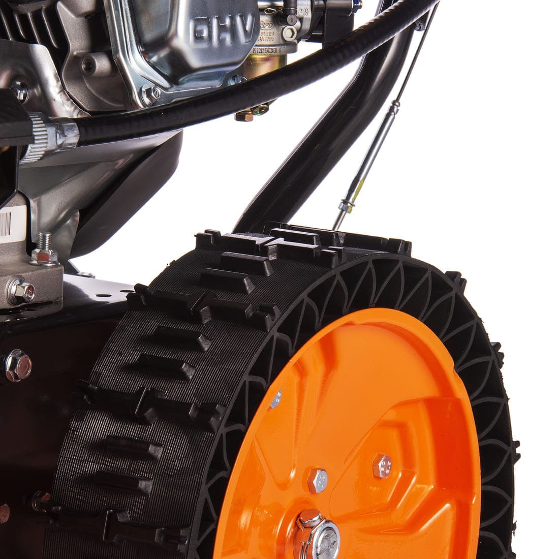 Полупрофессиональная модель с повышенным сцеплением и стабильной производительностью для уборки снега разной сложности. SnowLink с глубоким протектором уменьшают пробуксовку на льду, обеспечивая тягу, сопоставимую с гусеницами. До 15 т/ч на влажном свежем снегу и до 5 т/ч на плотном — благодаря балансу мощности, захвата и сцепления. Усиленная кромка и агрессивная геометрия уверенно дробят слежавшийся снег и наледь. Металлический лоток поворачивается рукояткой с корпуса — направление и дальность выброса под контролем. Металлоконструкция с добавлением холодостойких сплавов рассчитана на работу при низких температурах. Шесть передач вперёд и две назад — удобно подобрать темп под тип снега и высоту покрова.