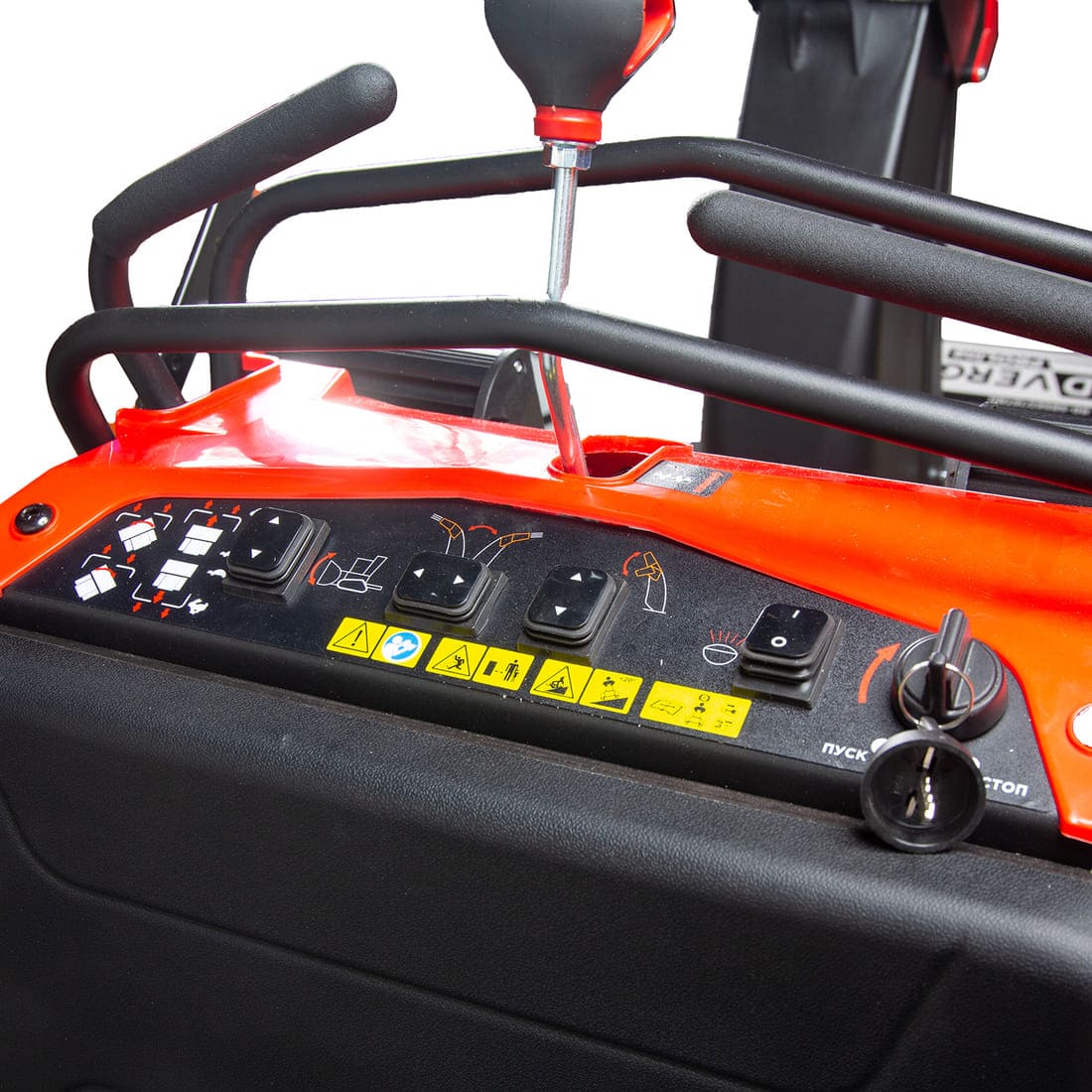 Управление реализовано двумя рычагами без остановок; низкий центр тяжести заметно повышает устойчивость на подъёмах и при разворотах.