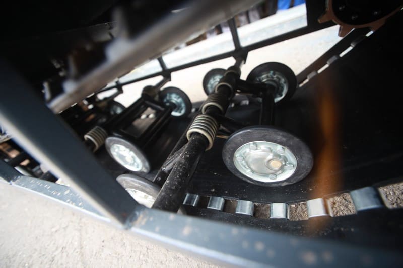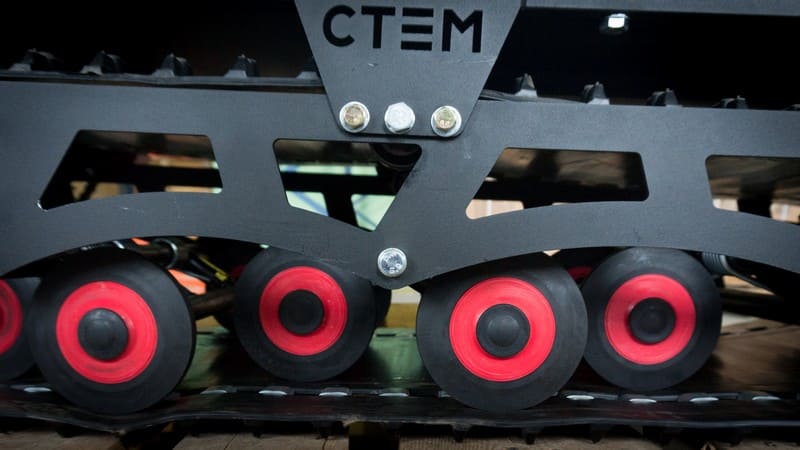 Цельная резиновая гусеница шириной 500 мм и катковая подвеска для устойчивого хода по снегу и льду.