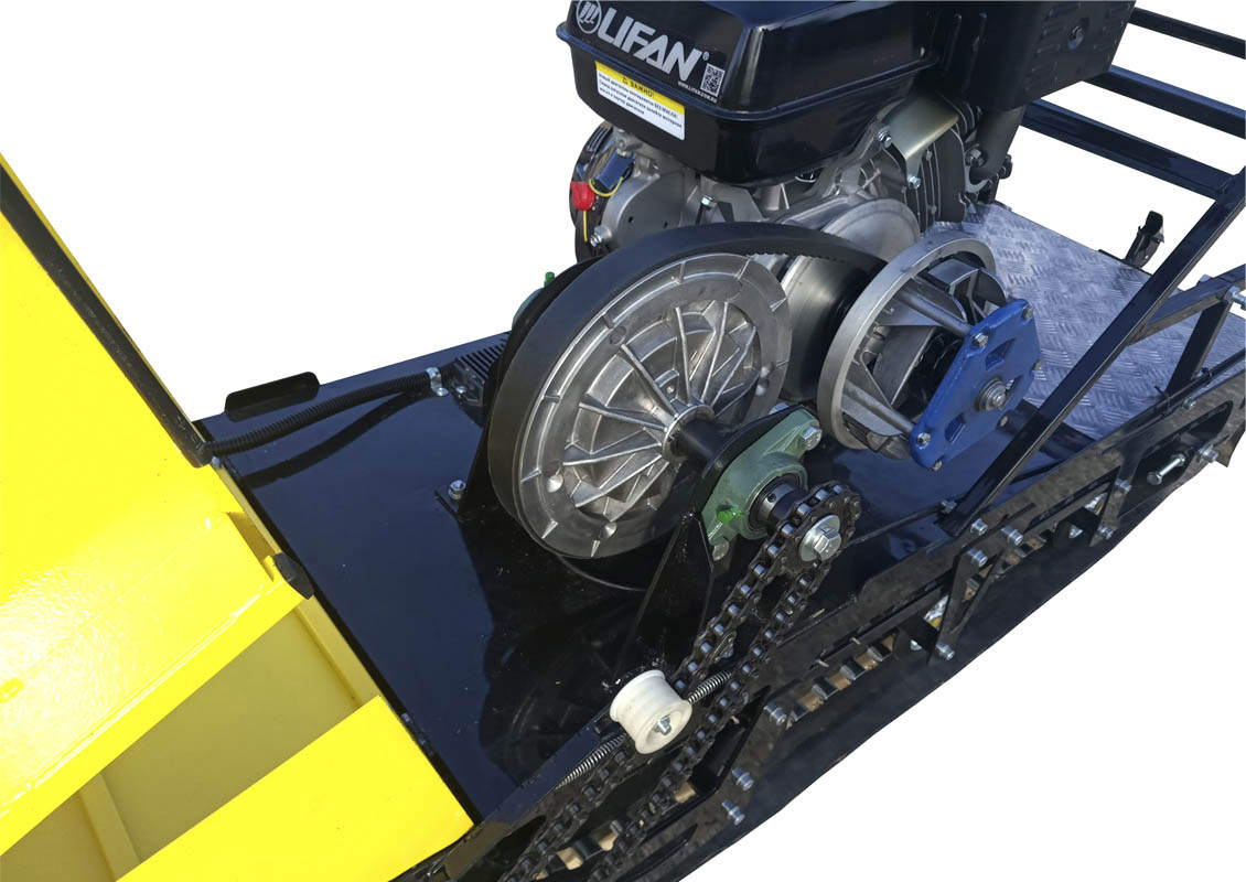 Всесезонный помощник для глубокого снега, перемётов и мягкого грунта: прост в эксплуатации и обслуживании. Надёжный двигатель 13 л.с. обеспечивает уверенную тягу и скорость до ~40 км/ч для перевозки груза и буксировки саней. Универсальная рамная конструкция со съёмным багажником выдерживает нагрузку и упрощает обслуживание. Плавная передача тяги и демпфирование двигателя помогают сохранять курсовую устойчивость на целине. Цельная резиновая гусеница в паре с катковой подвеской уверенно держит лёд и участки без снега. Длина 123 см, ширина 54 см и масса 95 кг помогают проходить узкие и сложные участки. Откидной стальной капот, защита цепи и LED-фара с регулировкой угла наклона для удобства в работе.