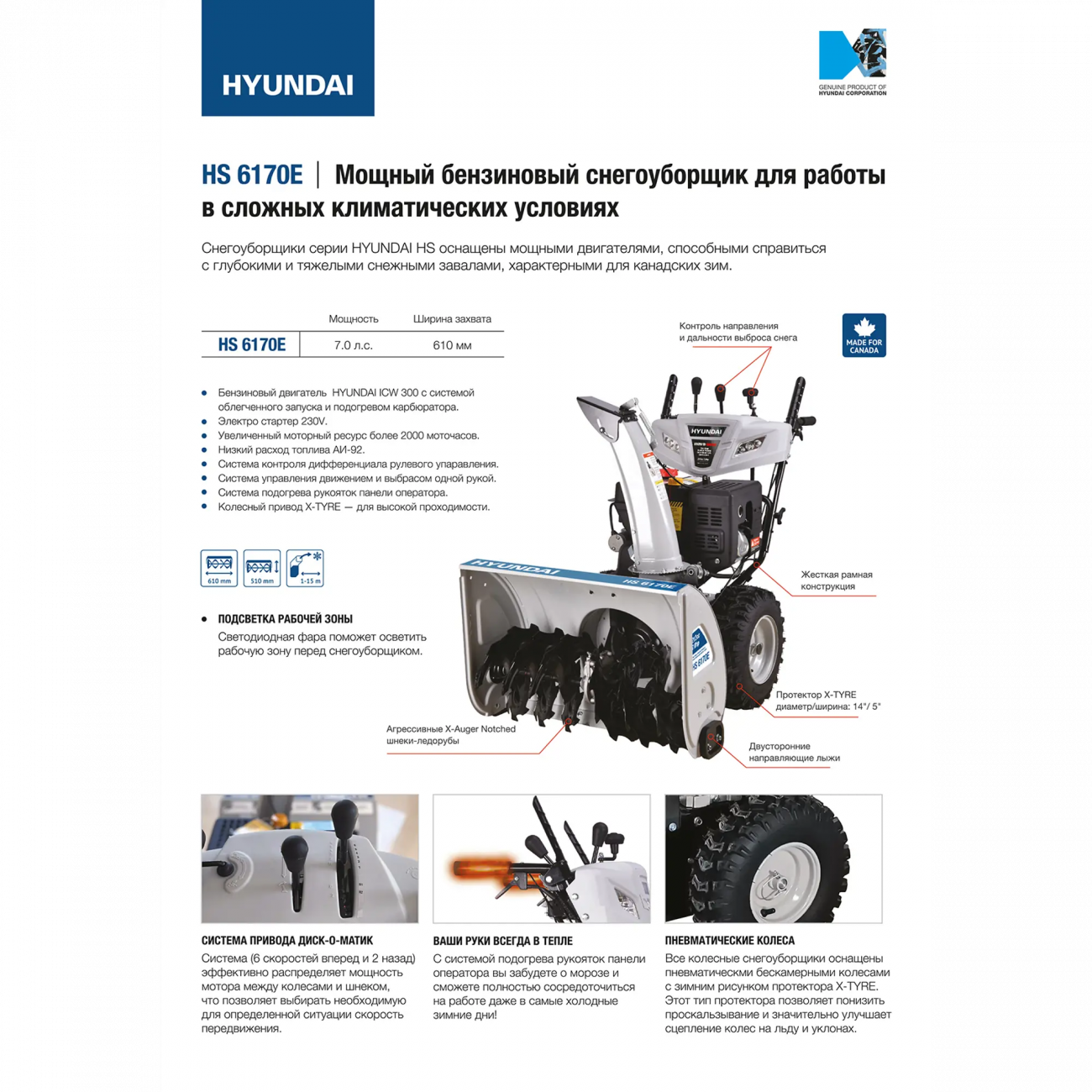 Снегоуборщик, руководство пользователя, гарантийный талон, базовый набор инструментов. Гарантия на снегоуборщик составляет 1 год. Сервис — в авторизованных центрах. Рекомендуется регулярное техническое обслуживание для продления срока службы устройства. Уточняйте технические детали и совместимость аксессуаров у специалиста.Самоходный снегоуборщик HYUNDAI S 6165-T