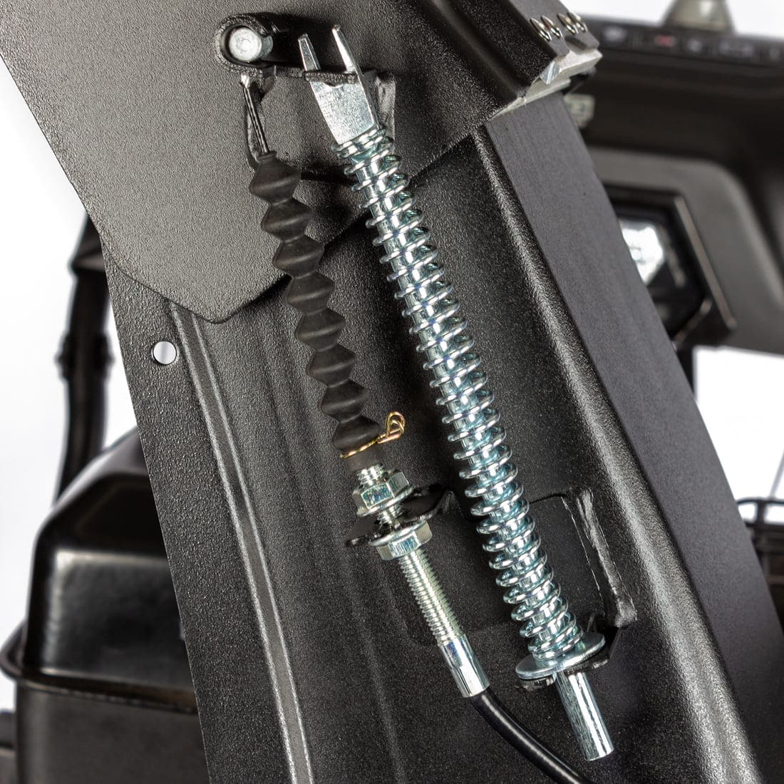 Двухсторонние опорные башмаки увеличивают срок службы кромок ковша и облегчают настройку по покрытию, а крупные колёса 16×4.8-8 повышают проходимость. Пуск реализован в двух вариантах — электрический и ручной — для удобства и надёжности.