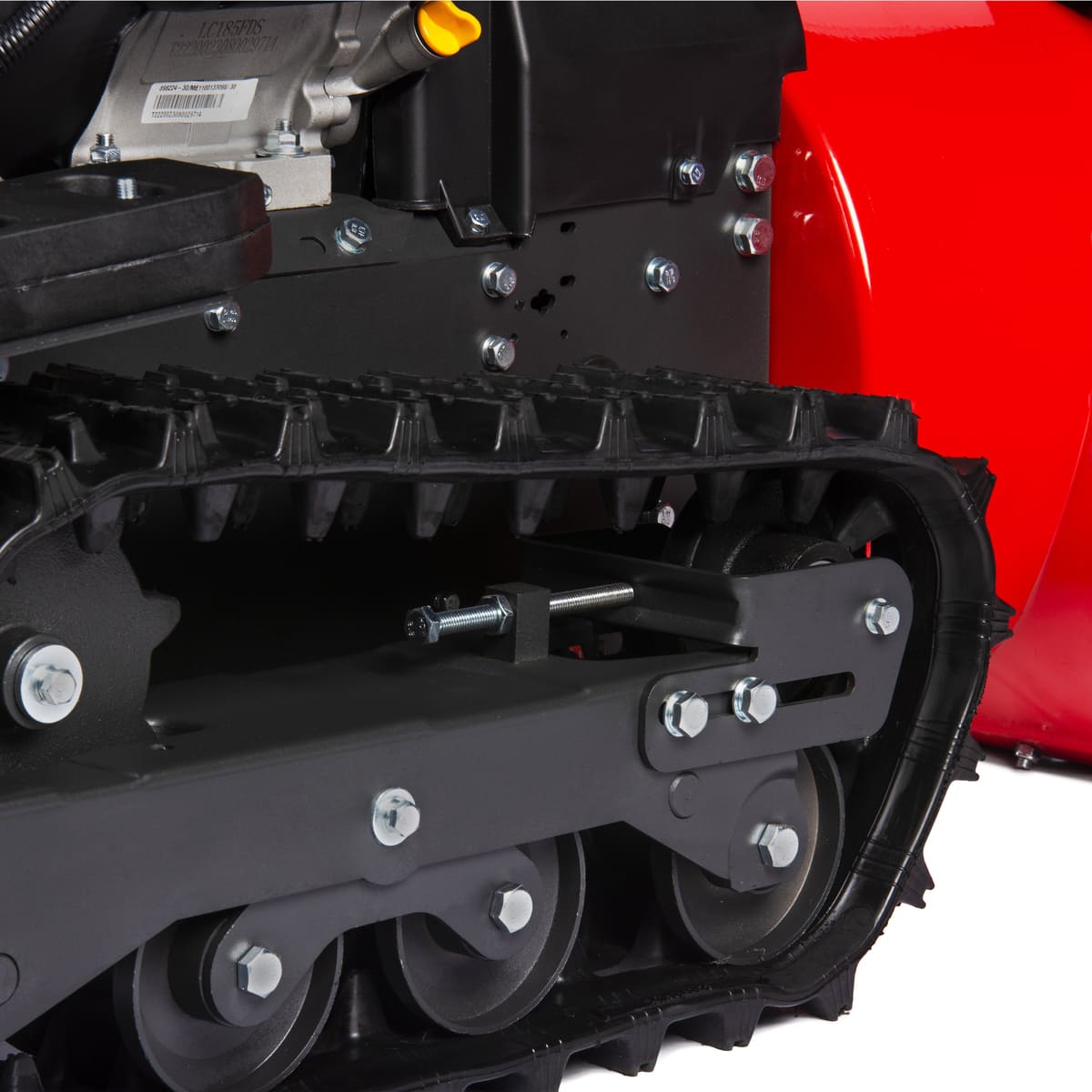 Профессиональная гусеничная машина с гидростатической трансмиссией и двухступенчатым выбросом — компактная, выносливая и крайне производительная. Верхнее расположение клапанов для эффективного смесеобразования, чистого выхлопа и повышенного ресурса. Чугунная гильза цилиндра, точная подгонка узлов. Соответствие CARB/EPA. Гидростатическая трансмиссия и вариаторная коробка Multitronic обеспечивают плавное изменение скорости/направления и реализацию крутящего момента до 300 Н·м на низких оборотах. Шнек с центральным ледорубом измельчает массу; крыльчатка из хромомолибденового сплава (до 1200 об/мин) отбрасывает снег на расстояние до 18 м. Смещённый к ковшу центр тяжести, редуктор ресурса 12 000 ч (масло 80W90), агрессивный шнек из легированной стали и трёхточечное крепление для работы по наста и льду. Гусеницы прямоугольного профиля с «антиналедь» и самоочисткой увеличивают пятно контакта, повышая проходимость на рыхлом и укатанном снегу и на склонах. Инновационная система дифференциала с ЭБУ обеспечивает разворот на месте и лёгкое маневрирование в ограниченном пространстве. Цельный корпус редуктора, оси в шарикоподшипниках, направляющие на ковше для снижения износа и увеличения ресурса при тяжёлых режимах. Регулировка положения и угла выброса с панели оператора во время движения.