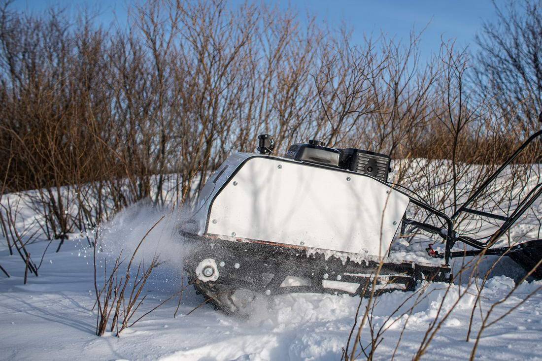Широкая гусеница 500 мм и катковая подвеска с балансирами обеспечивают уверенный ход по целине и насту.