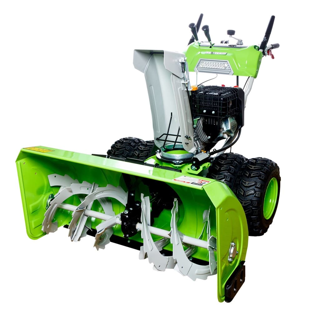 Для лёгкого пуска в мороз предусмотрен электростартер от сети 220В, а ручной стартер остаётся надёжным резервом. Колёса с глубоким протектором и регулируемые лыжи помогают выбрать оптимальный клиренс и повысить устойчивость на обледенелых участках.