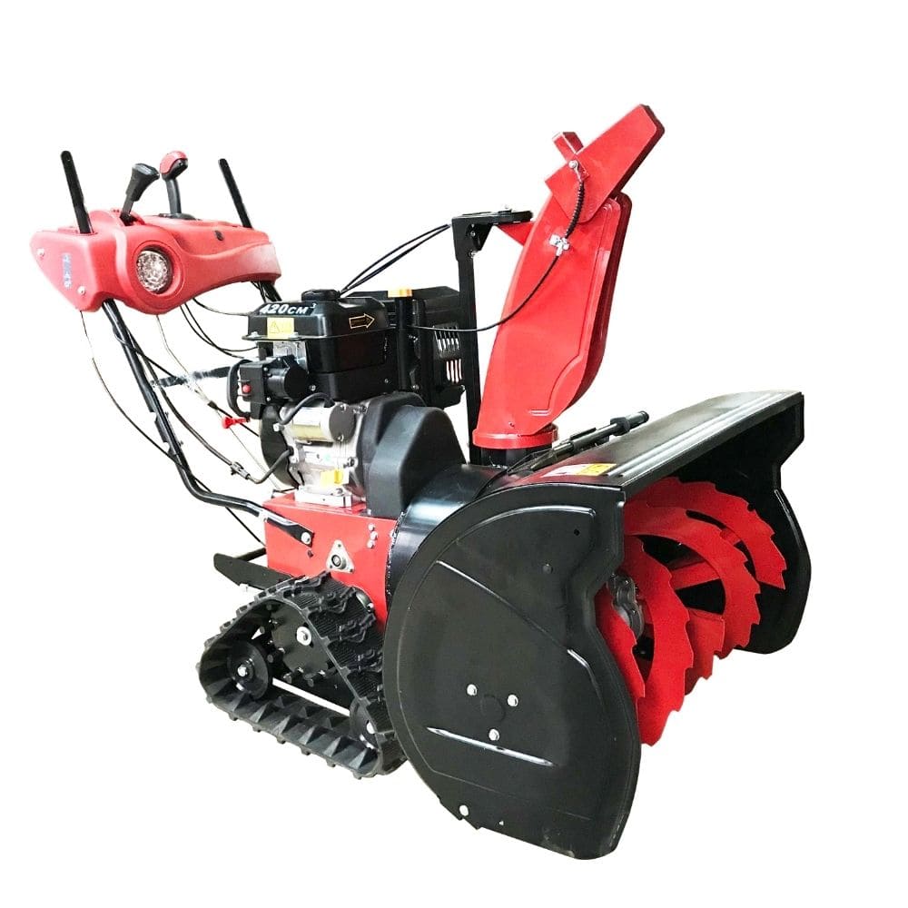 Трансмиссия с 6 скоростями вперёд и 2 назад помогает подобрать оптимальный темп в разных условиях. Двухступенчатая система с металлическим зубчатым шнеком эффективно дробит наст и подаёт снег на крыльчатку для дальнего выброса. Гусеничный привод повышает устойчивость и тягу на скользком покрытии, а фара делает работу комфортнее в сумерках.
